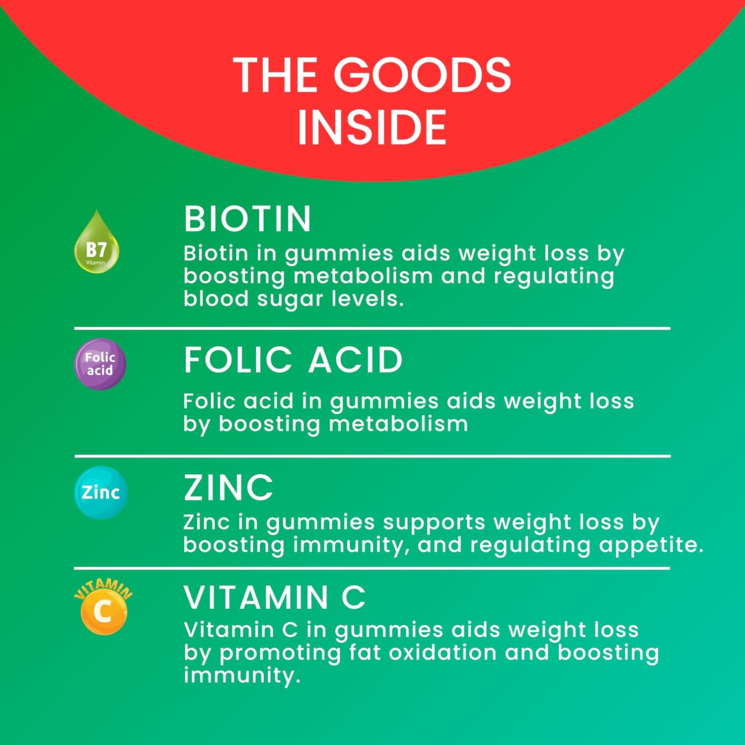 Enhances Metabolism: These gummies contain folic acid and biotin, which work together to enhance carbohydrate and lipid metabolism, providing steady energy throughout the day and supporting efficient fat breakdown.