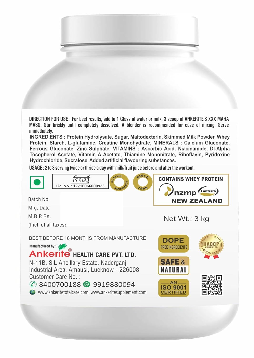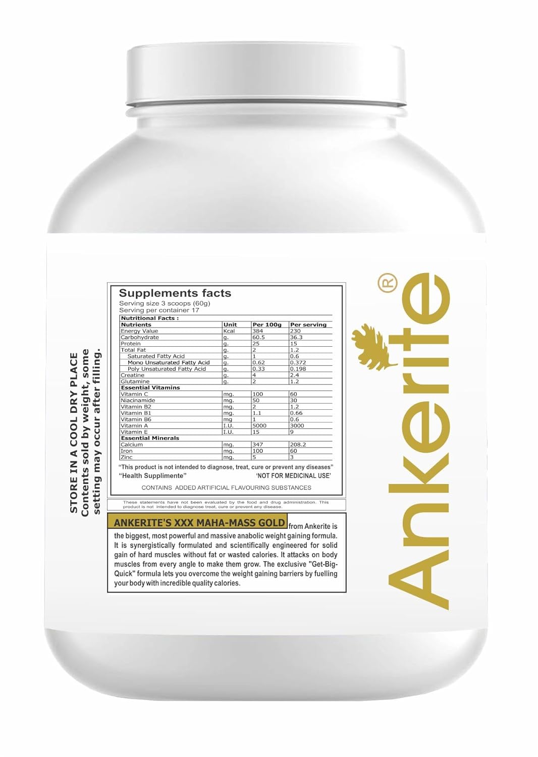 Ankerite’s XXX Maha Mass Gold is the biggest, most powerful and massive anabolic weight & mass gainer formula.Ankerite’s XXX Maha Mass Gold synergistically formulated and scientifically engineered for solid gain of hard muscles, mass & weight gainer without fat or wasted calories. It makes the best weight gain supplement for men, women, athletes, and bodybuilders. It provides all day long calorie supply to the body for the synthesis of new muscles and prevent muscle loss.Ankerite’s XXX Maha Mass Gold is the right product for weight and mass gainer formula.