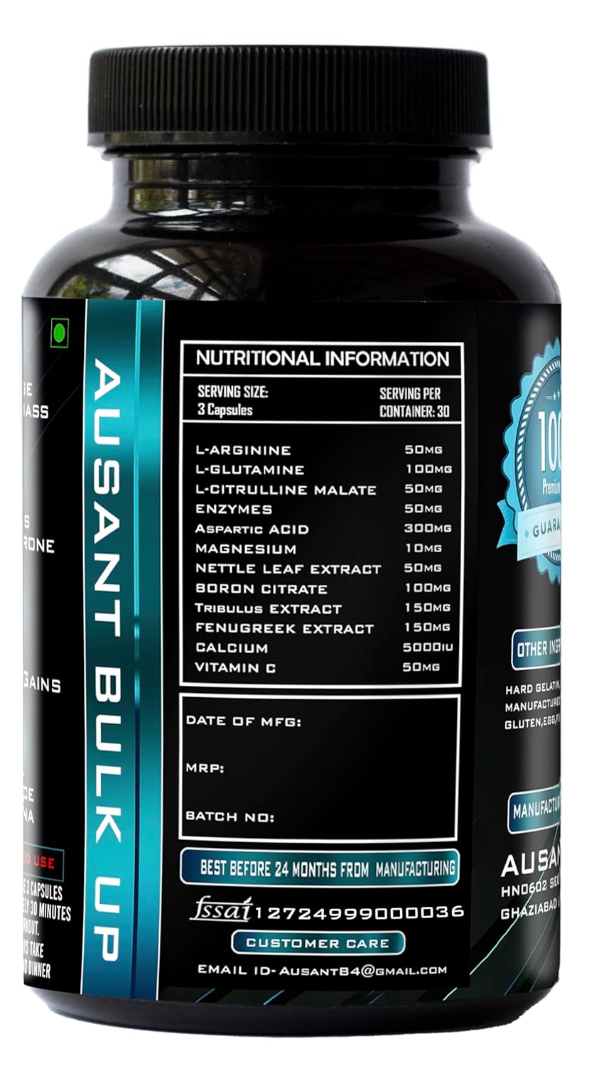 BUILD MASSIVE MUSCLES: Ausant BULK UP is the best mass and muscle gainer capsule for men and women who want to build massive muscles naturally. With its powerful formula, you can gain size, strength, and stamina quickly and easily.
