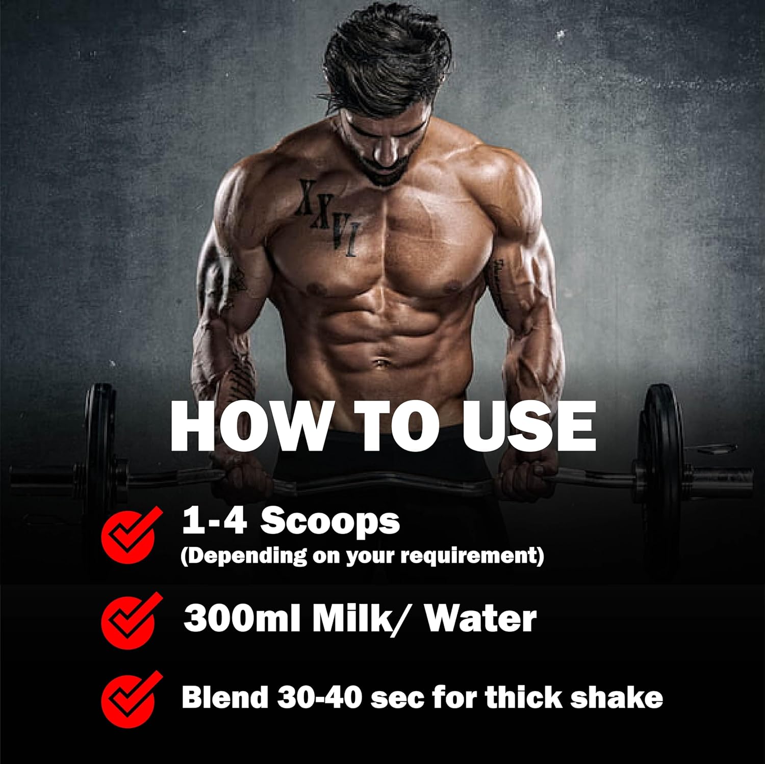 DIRECTIONS: Add 1-4 scoops (depending on your requirement) to water / milk, blend it properly to get a rich shake. Adjust the amount of liquid to meet your desired taste and consistency.