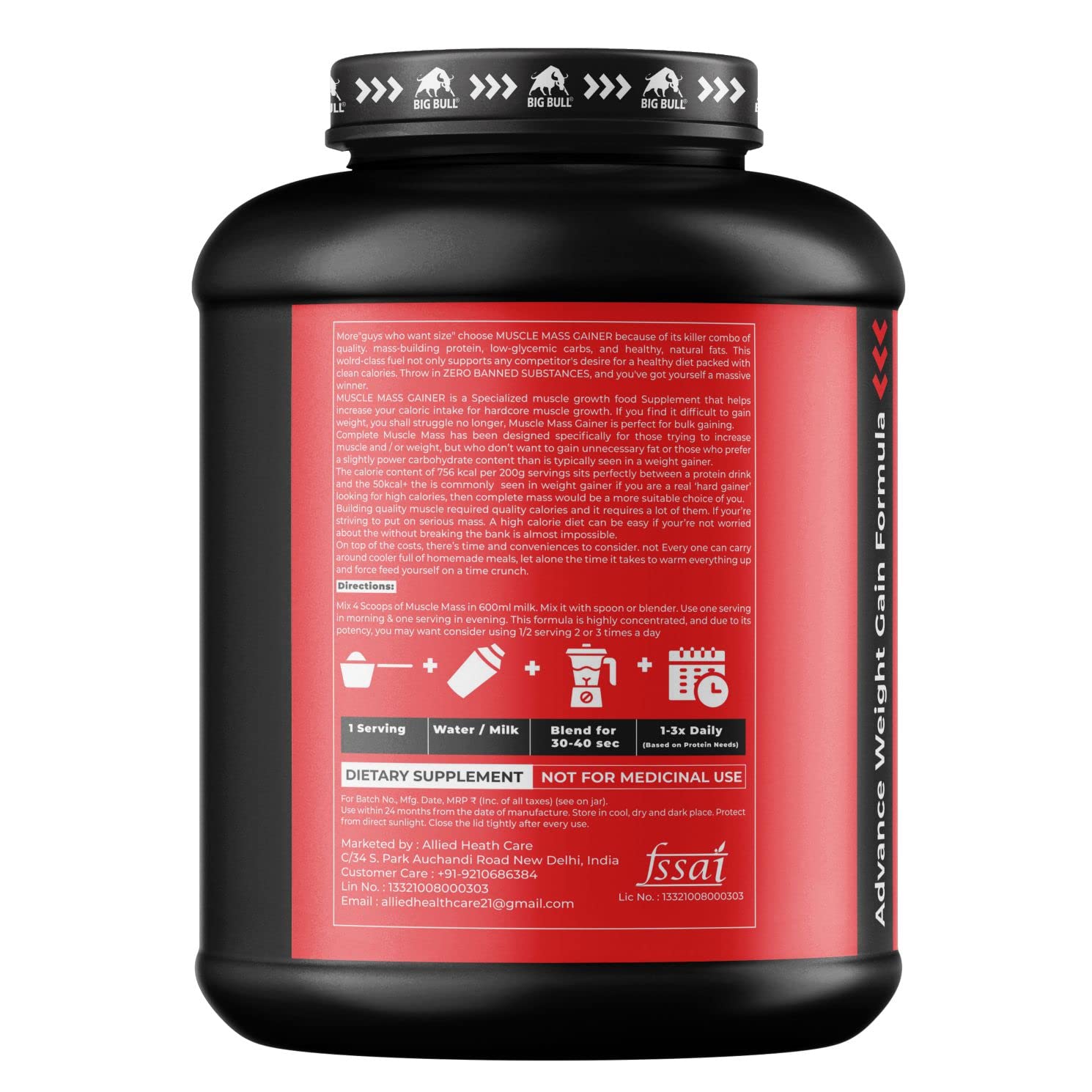 BIG BULL Muscle Mass is a high-calorie weight gainer providing 1,053 calories per serving (4 Scoops) fortified with muscle-building protein, carbohydrates, creatine monohydrate, taurine, and essential nutrients.