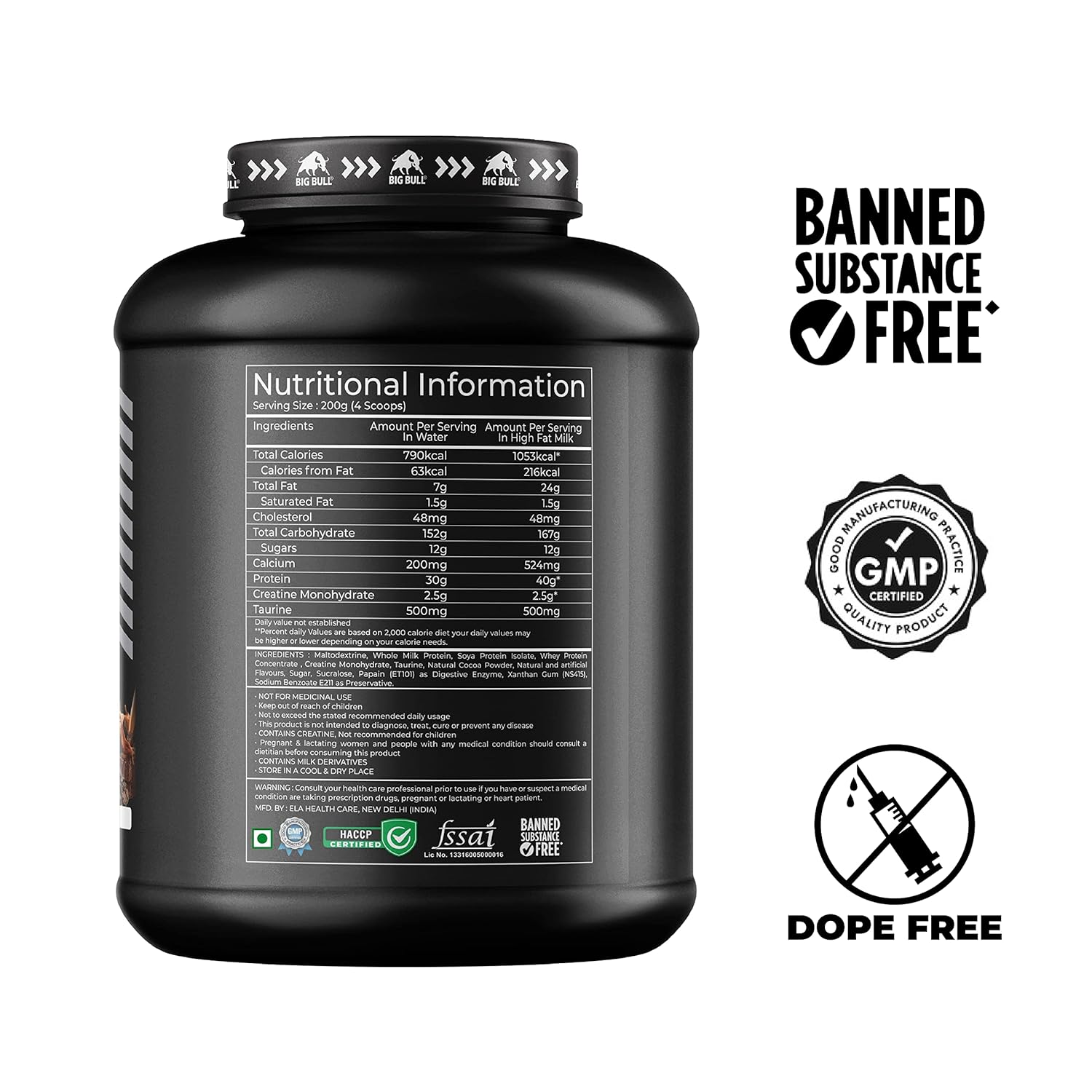 Mass Gainer by BIG BULL includes multivitamins and minerals to support the immune system, boost energy and metabolism to enhance workout performance. Added digestive enzymes and dietary fiber help in the absorption of the nutrients for maximum benefit.