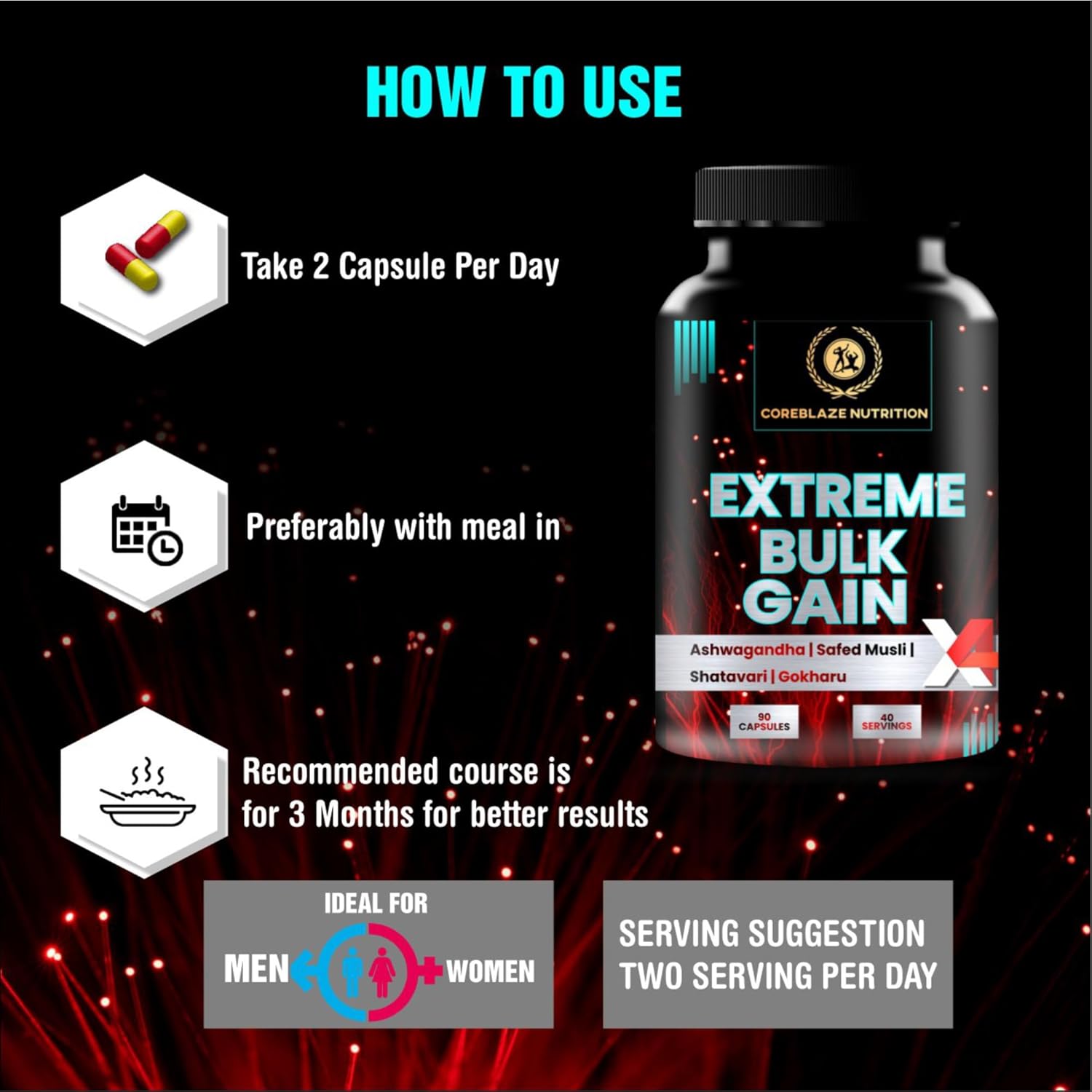 Extreme Bulk Gain Mass & Weight Gainer Capsule for Fast Weight & Muscle Gain, Daily Muscle Building Weight Lifters Supplement for Muscle Growth, Stamina & Strength, For Men & Women- 90 Cap (Pack of 1)