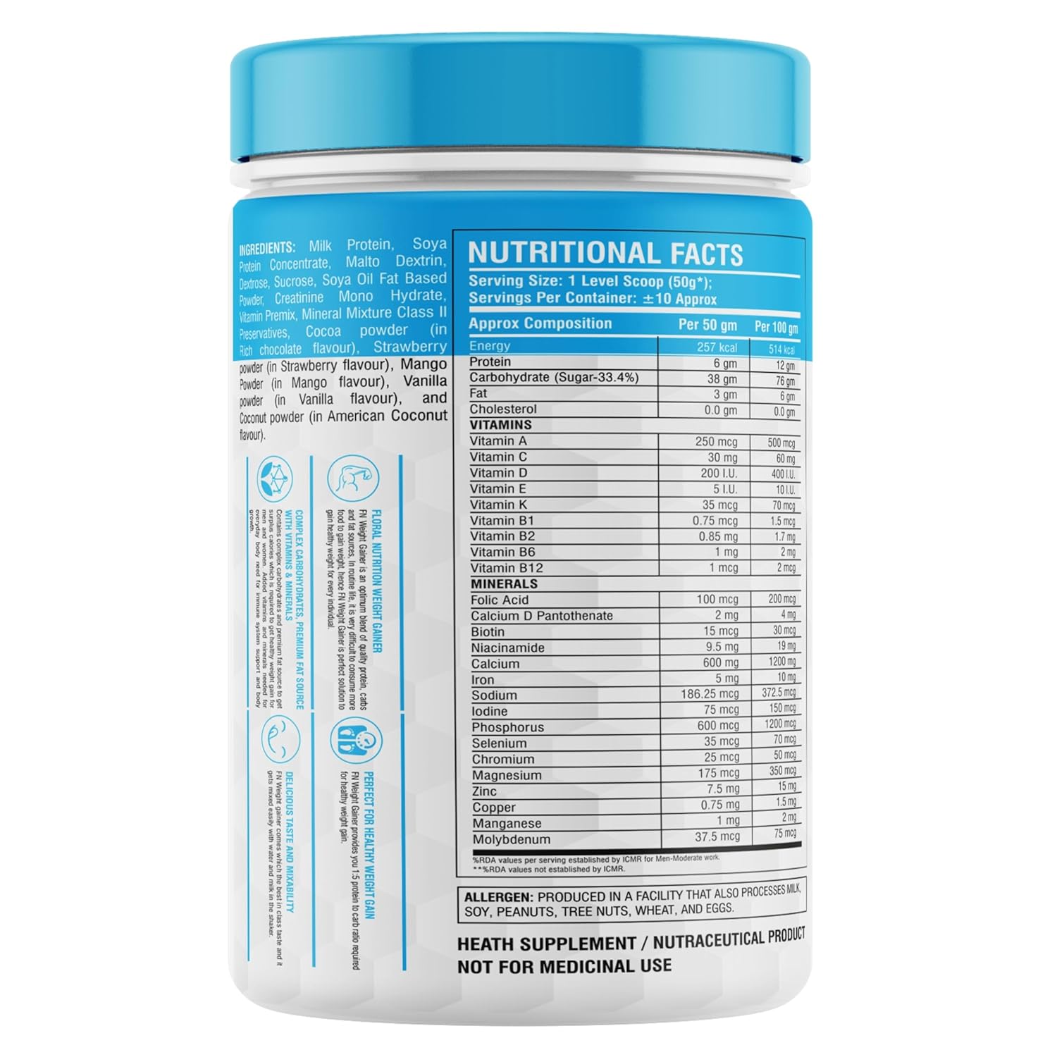 514 k calories : This Weight Gainer with 514 k calories energy per serving with milk to promote faster muscle synthesis and prevent post-workout muscle loss.