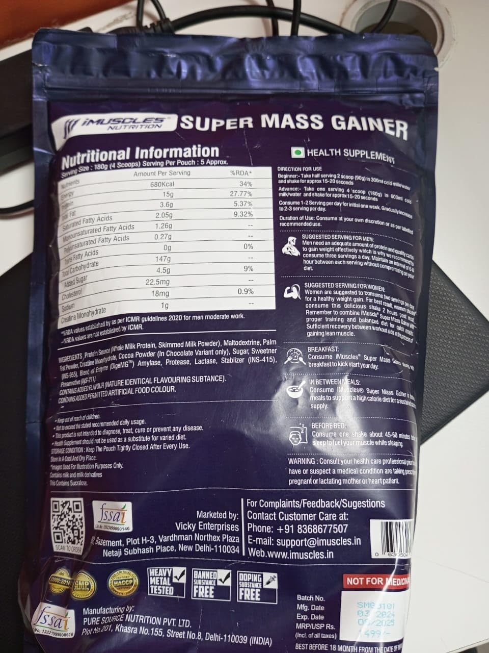High-Protein Muscle Mass Gainer: This iMuscles Mass Gainer is formulated with a blend of protein sources including whole milk protein, soya protein isolate, and skimmed milk powder, along with other essential nutrients, to support muscle mass gain effectively.