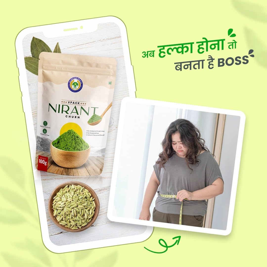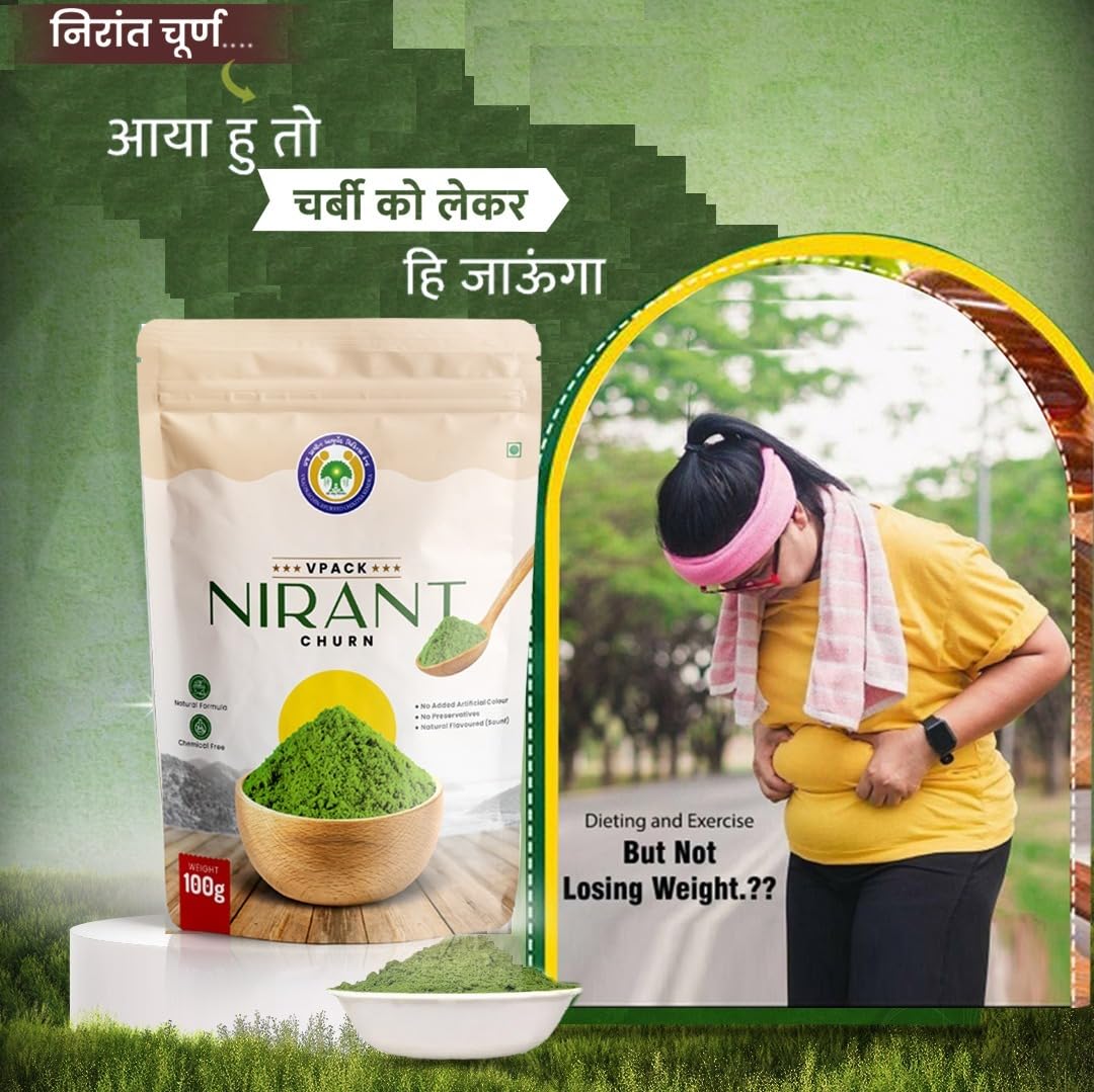 NIRANT CHURN HAS 100% NATURAL INGREDIENTS. THE INGREDIENTS ARE FENNEL, CURRY LEAVES, GINGER, PARSLEY, TRIPHALA, AND MISHRI POWDER. HOW TO USE:- 1. TAKE ONE SPOONFUL OF NIRANT CHURNA 2. TAKE EASY WITH WARM WATER BEFORE SLEEP AND FOR SURE FOR RELIVES IN REDUCING BELLY FAT, CONSTIPATION, STOMACH HEAT, ACIDITY, SKIN DISEASE, AND BURNING EYES.